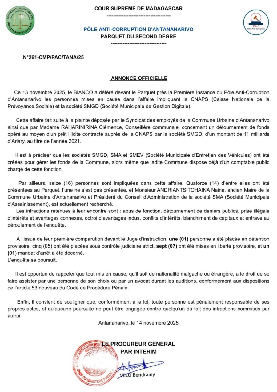 Le communiqué officiel du Pôle Anti-Corruption d’Antananarivo, daté du 14 novembre 2025, a fait l’effet d’un pavé dans la mare : 11 milliards d’Ariary détournés, 16 personnes impliquées, arrestations, contrôles judiciaires et un ancien maire qui, comme beaucoup avant lui, semble s’être volatilisé au moment d’affronter la justice. Une affaire de plus, penseront certains. Mais une affaire de trop, diront ceux qui aspirent encore à une véritable refondation institutionnelle.